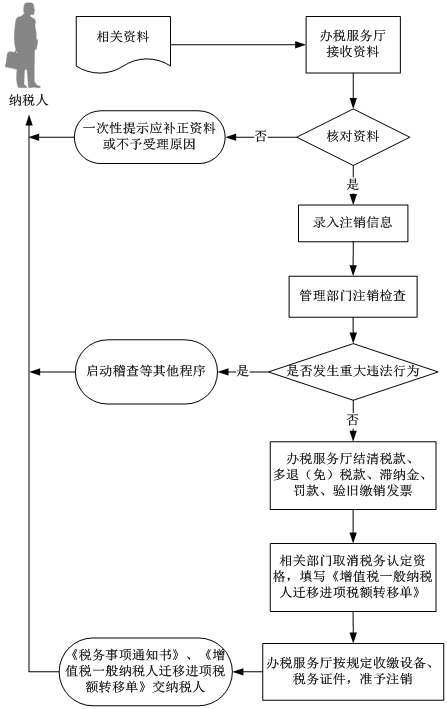 (3)辦稅服務(wù)廳結(jié)清應(yīng)納稅款、多退(免)的稅款以及滯納金、罰款,繳銷稅務(wù)登記證及副本,《發(fā)票領(lǐng)用簿》和其他稅務(wù)證件,制作《稅務(wù)事項(xiàng)通知書》交納稅人。